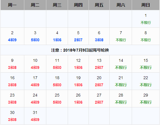 2018年7月份限行日历